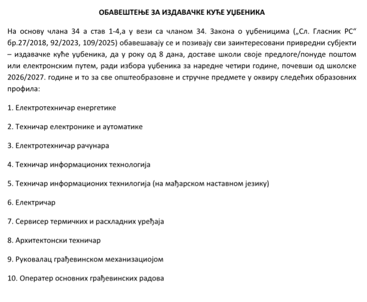 ОБАВЕШТЕЊЕ ЗА ИЗДАВАЧКЕ КУЋЕ УЏБЕНИКА